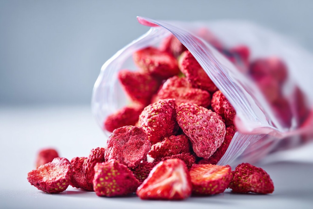 Bei der Gefriertrocknung werden Erdbeeren zunächst tiefgefroren. Anschließend wird ihnen das enthaltene Wasser entzogen – allerdings nicht durch Hitze, sondern durch ein physikalisches Verfahren: