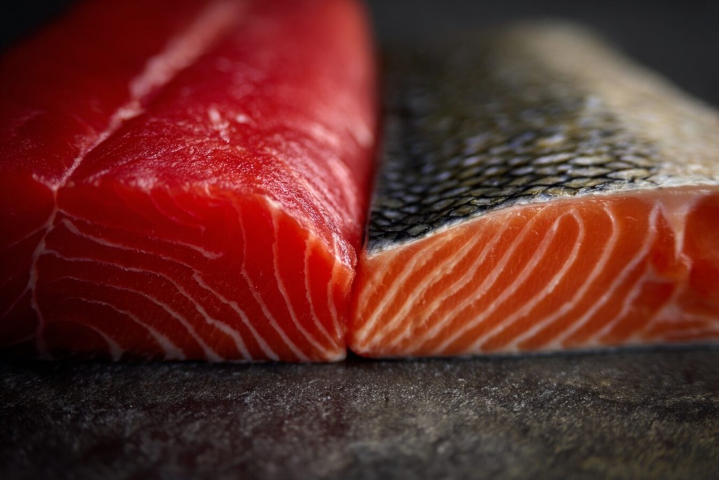Split-screen Darstellung verschiedener Lachsfilets im Querschnitt, deutlicher Unterschied in Farbe und Fettmarmorierung zwischen Atlantischem Lachs, Sockeye, Coho und Königslachs